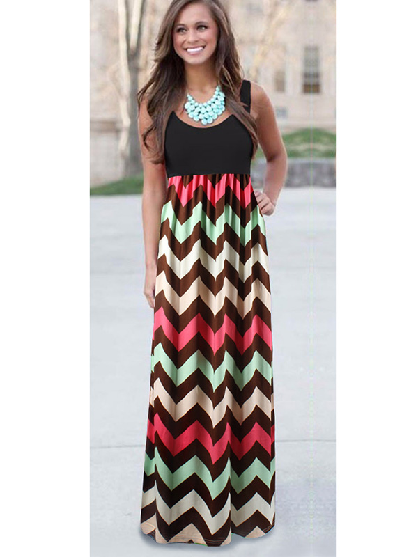 Fashion U Neck Patchwork Colorful Wavy Print Blending Bohemian Dress Model Show: