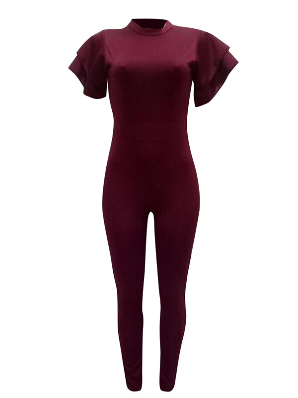 Wine Red Round Neck Lotus Leaf Sleeves Jumpsuits