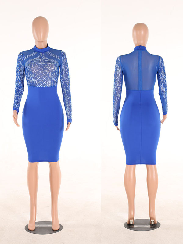 Home » Women's Dresses » Bodycon Dresses » Blue Mandarin Collar Printed Patchwork Bodycon Dress