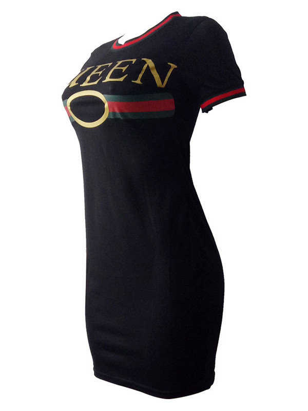 Black Round Neck Letters Printed Casual Dress