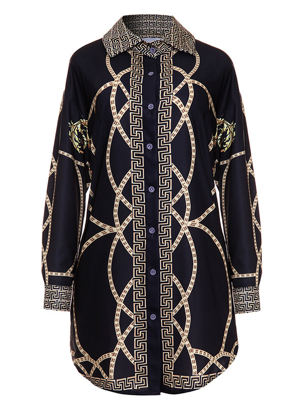 Black Trendy Turndown Collar Printed Dress