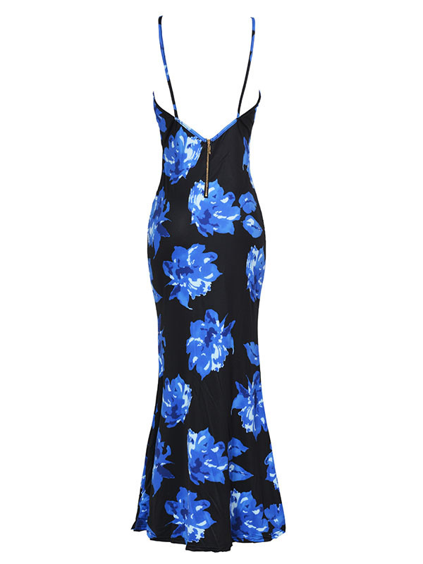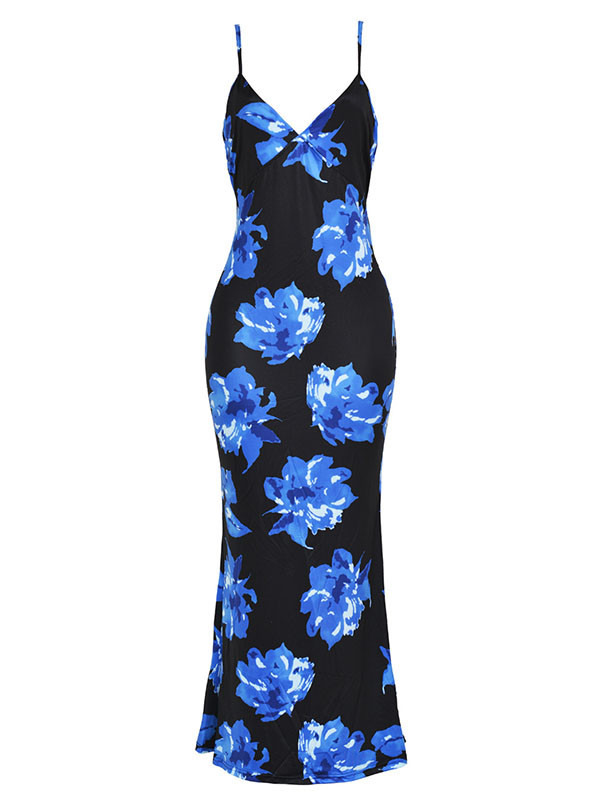 Blue S-XXL Floral Print Sleeveless Long Dress