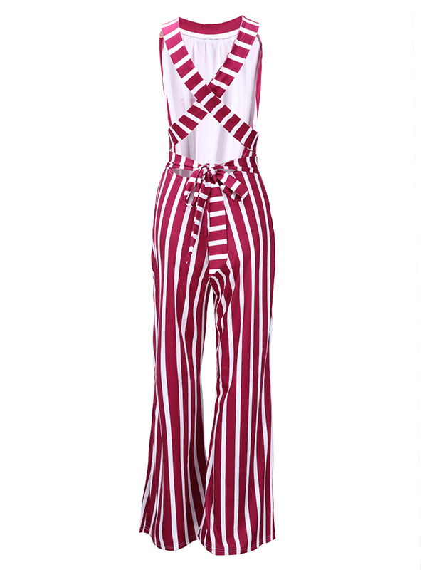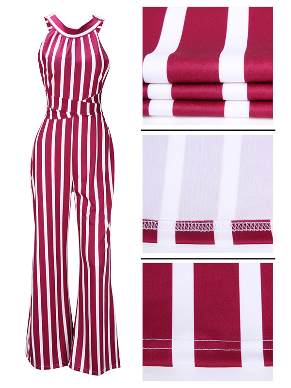 » Jumpsuit & Romper » Jumpsuit » Women Wine Red Halter Strap Stripe Backless Sleeveless Jumpsuits RompersModel Show: