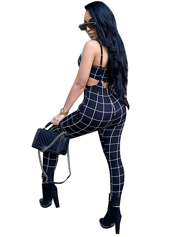 » Jumpsuit & Romper » Jumpsuit » Summer Black Plaid Sexy Skinny Waist Band Cut Out Women JumpsuitsModel Show: