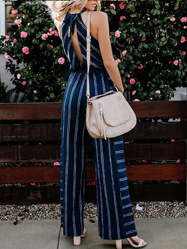 Home » Jumpsuit & Romper » Jumpsuit » Blue Stripe V-neck Open Back Sleeveless Jumpsuit