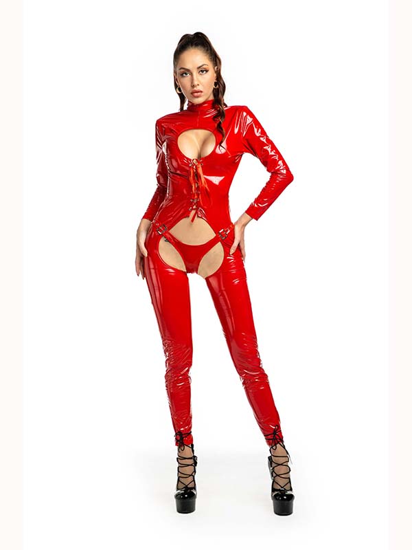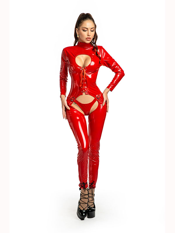 Red Women Long Sleeve Sexy Vinyl Jumpsuit