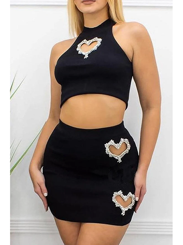 » Sexy Clubwear » Club Dresses » Women Heart Cutout Rhinestone Decor Sleeveless Top & Mini Bodycon Skirts Sets
