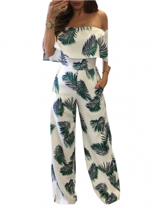 Green Dew Shoulder Print White Milk Jumpsuits W650146A