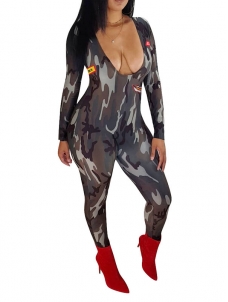 Sexy Deep V-neck Long Sleeve Camo Jumpsuit With Lip Pattern WE725242