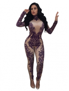 Sexy Turtleneck Printed Purple Polyester One-piece Jumpsuits W650373