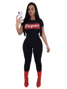Front Letter Print Solid Short Sleeve Jumpsuit Black WT41886E