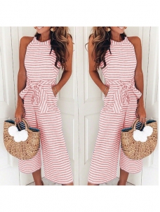 Women Stripe Sleeveless High Waist Jumpsuit Pink WE828573A