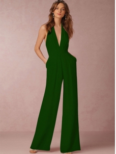 Halter V Neck Backless Wide-Leg Jumpsuit Dark Green W960017J