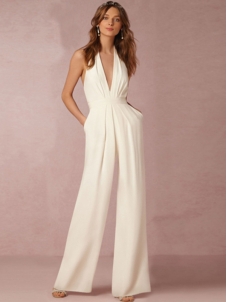 Halter V Neck Backless Wide-Leg Jumpsuit White W960017A
