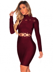 Wine Red Long Sleeves Hollow-out Bodycon Dress W650489B